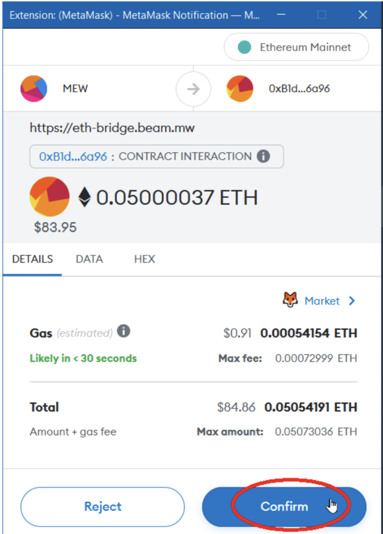 Click on "Beam to Ethereum" in the next window. Click "Ethereum side of the bridge", prompting a browser pop-up to appear in your browser.