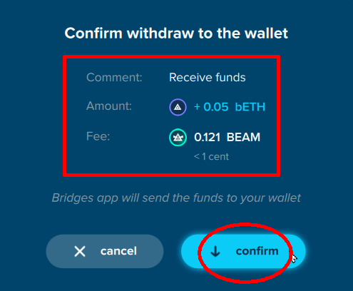 Once the transfer is complete, the bETH will be available to withdraw from the Bridges app into your Beam wallet.