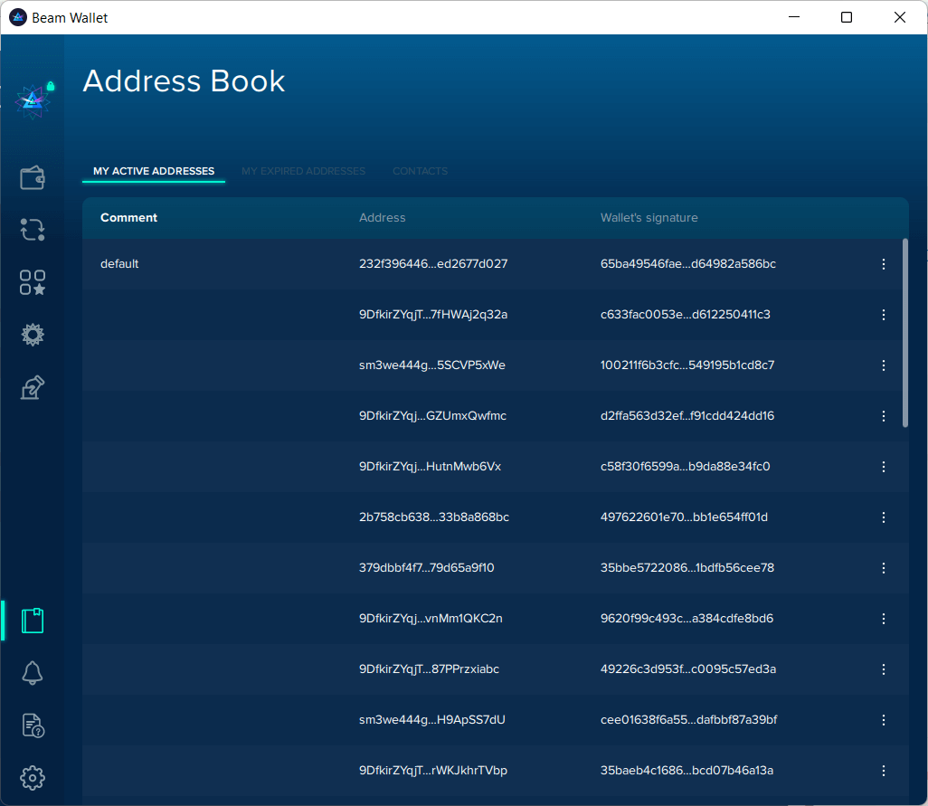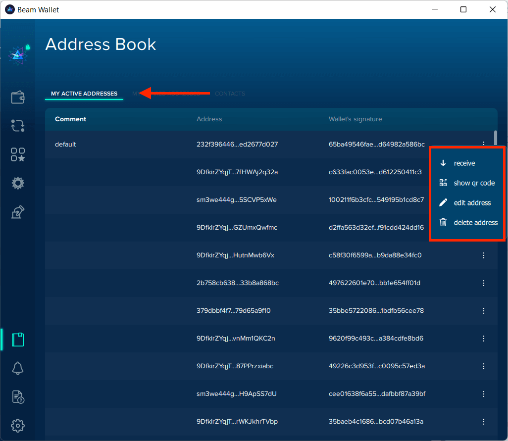 - My Active Addresses: active wallet addresses are secure and ready to send or receive Beam coins.