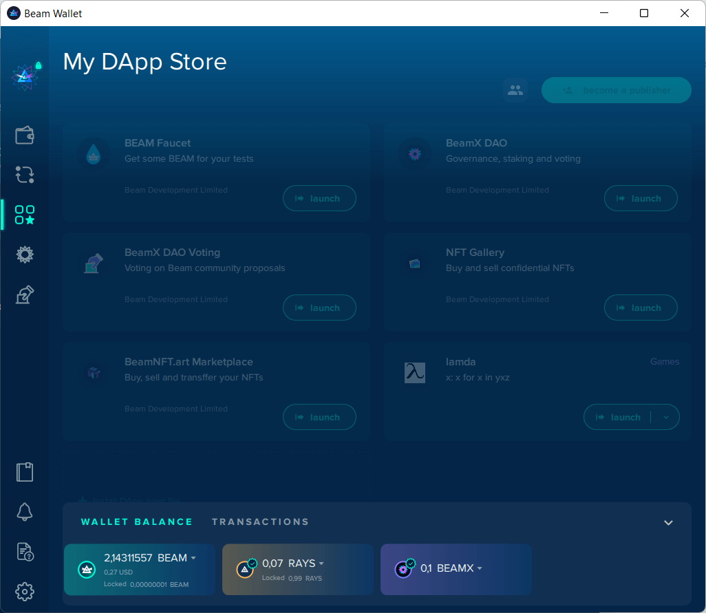 Beam's DApp store is open-source and entirely built on the Beam blockchain. Users can become developers and contribute decentralized applications to the DApp Store.