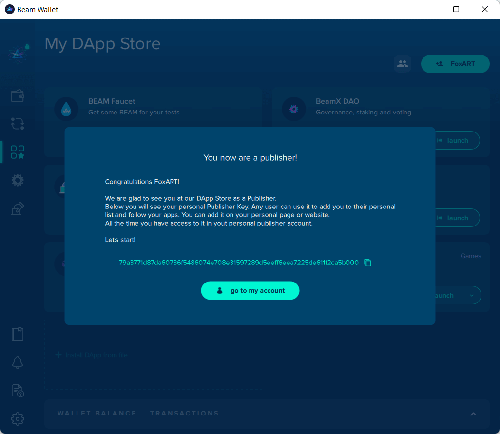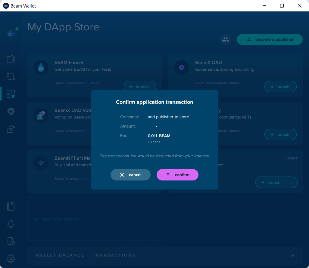 5. Confirm payment of .011 Beams to create your publisher account. Please wait for your account approval (remember to record and save your publisher key).