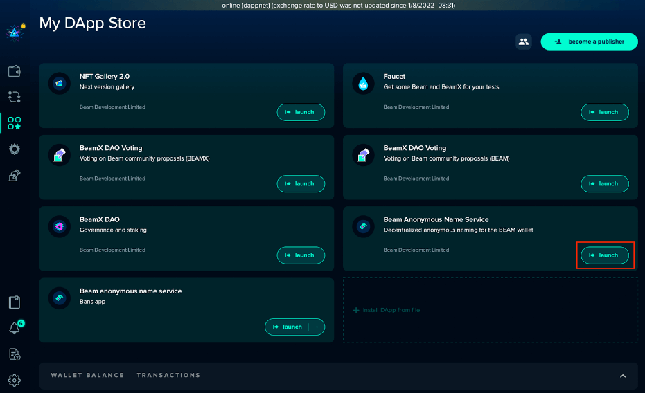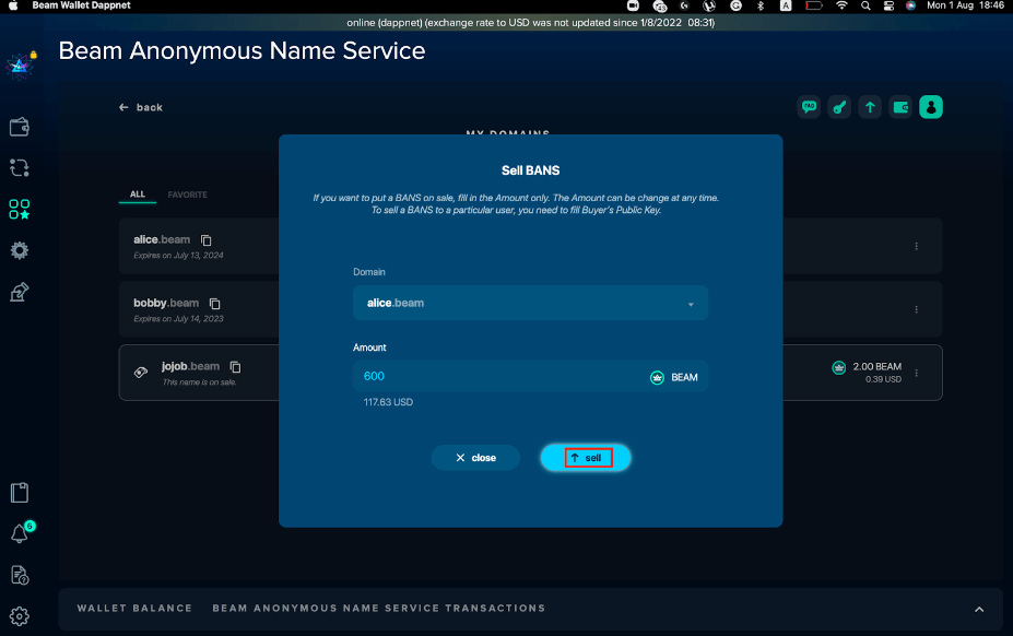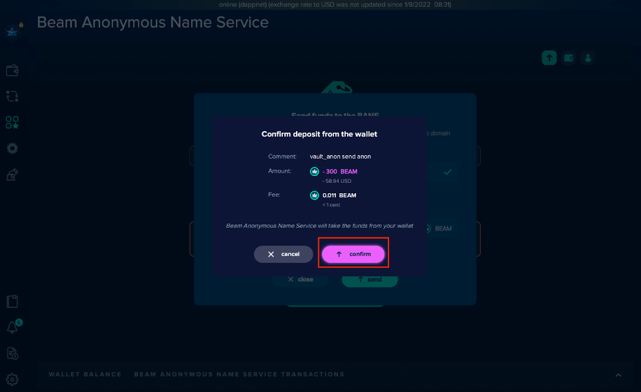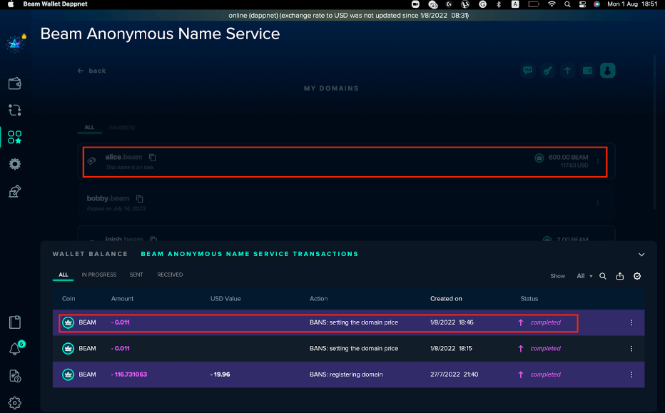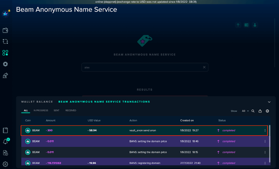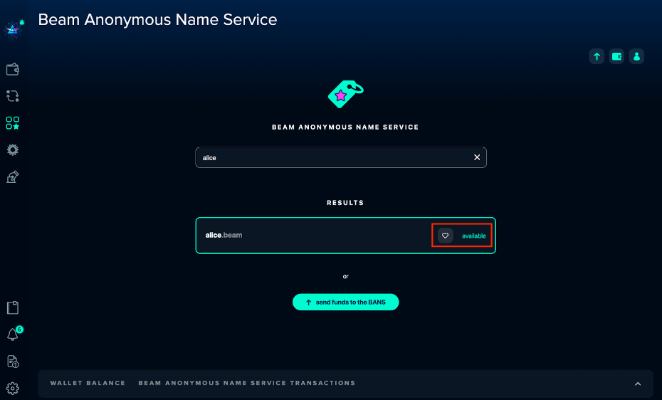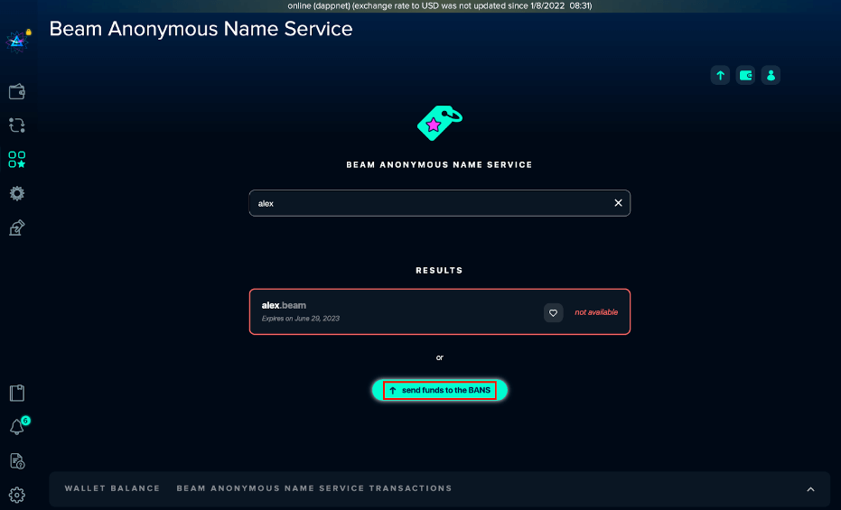 Users can send Beam directly to a BANS domain and avoid the headache of sending to a wallet address. Beams coins are the only asset currently available to send via BANS DApp.