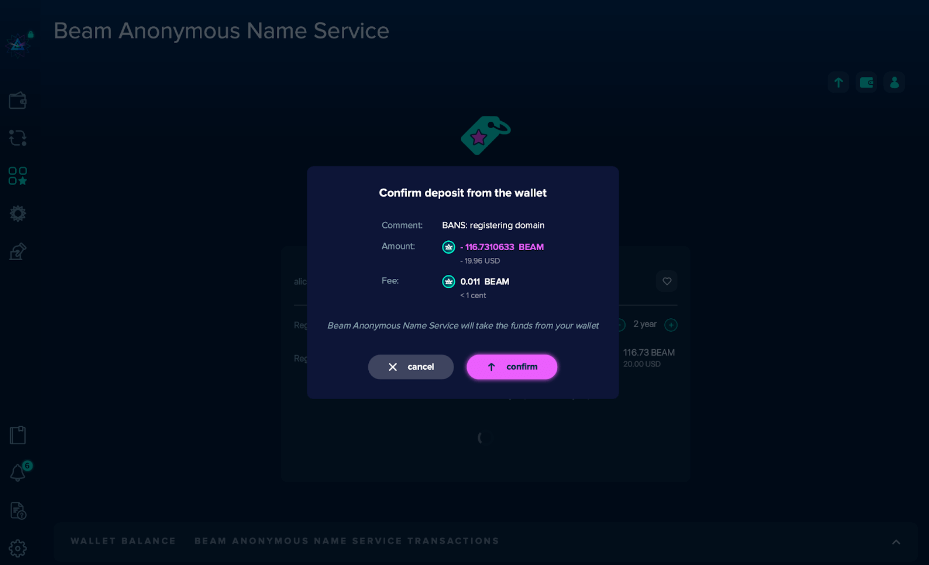 BANS domains link to Beam wallets and bypass the traditional way of sending and receiving cryptocurrency (via a long alpha-numeric string of characters) by allowing users to send (and receive) assets to a simple domain name built on the Beam blockchain.