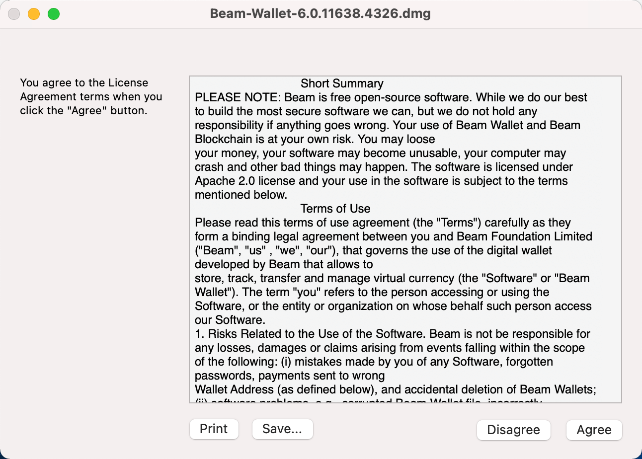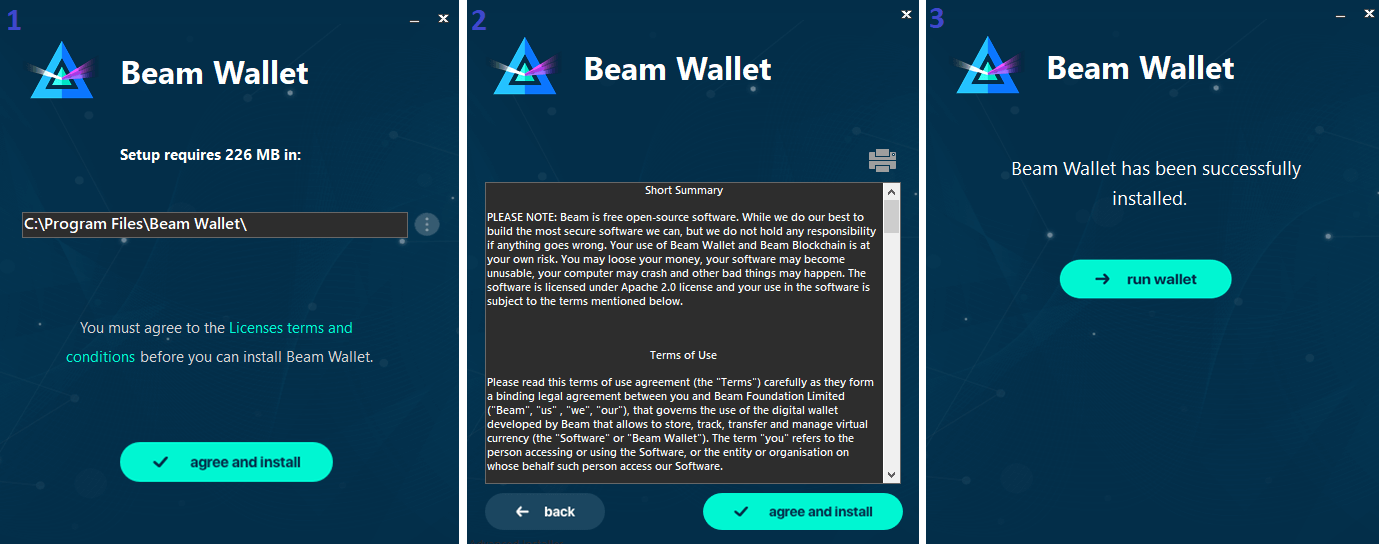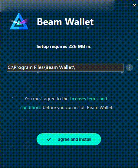When you click on the Beam-Wallet-6.0.11638.4326.exe file installer will run. You’ll see a default path to the wallet, which you can change using the action menu. Also, it suggests you read Licenses Terms and Conditions. A default path to the wallet will display on the opened screen.