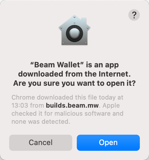 Launch Beam Wallet from the "applications" folder. Please note: Beam is in the approval stages for the desktop wallet app on the Apple store, until then click "open" when the notification below appears: