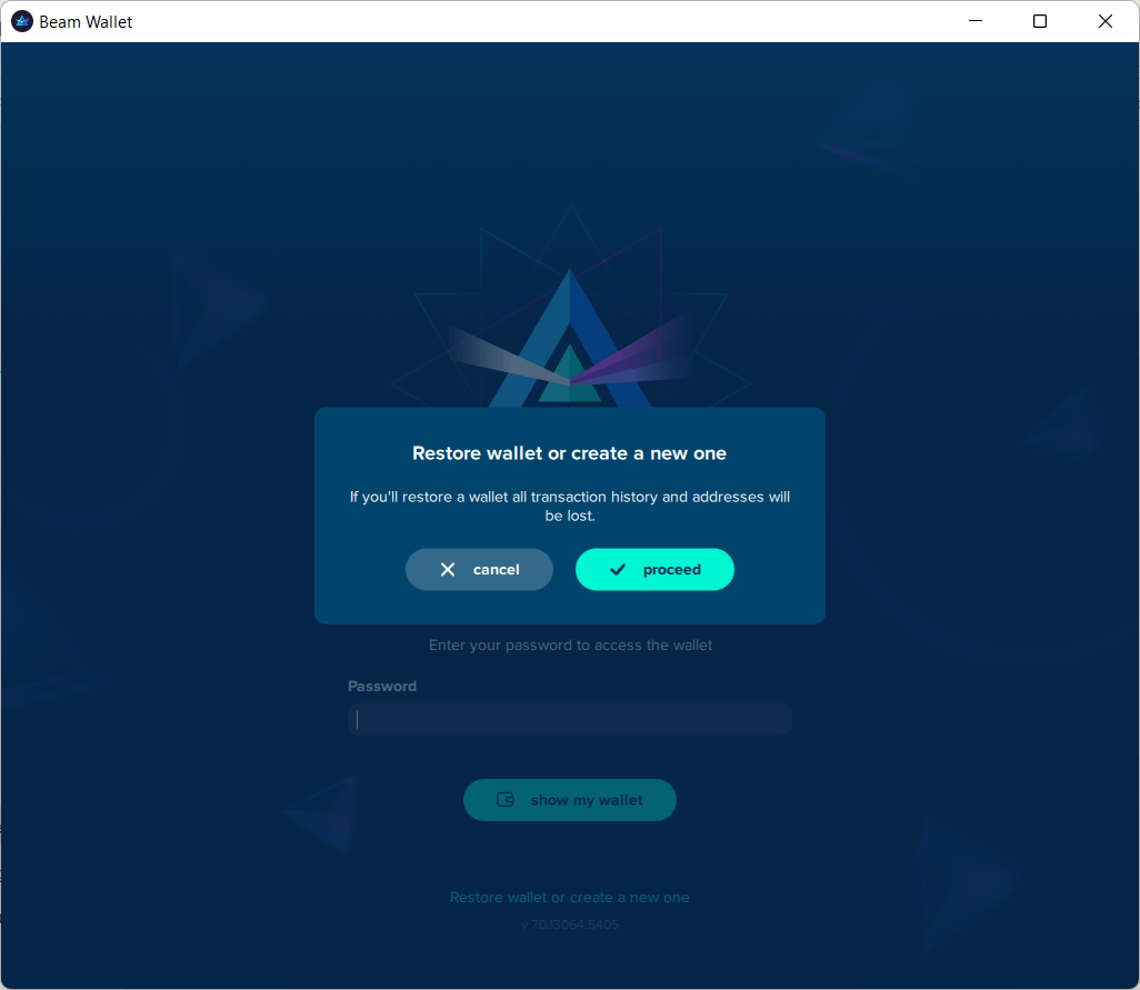 . - Click "restore wallet or create a new one" > "Proceed" to restore your wallet.