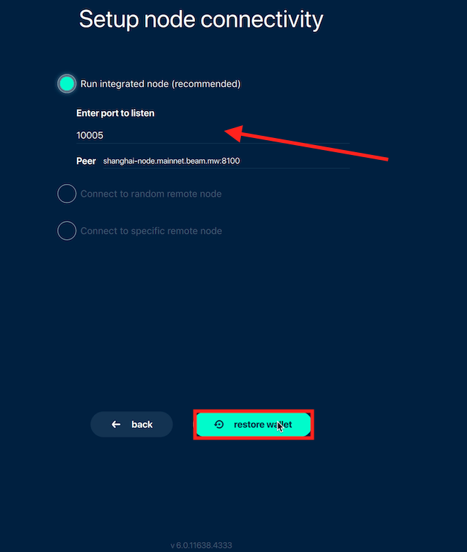 - Select node connectivity mode > Click "Restore wallet" to complete the wallet restoration process.