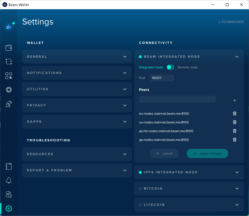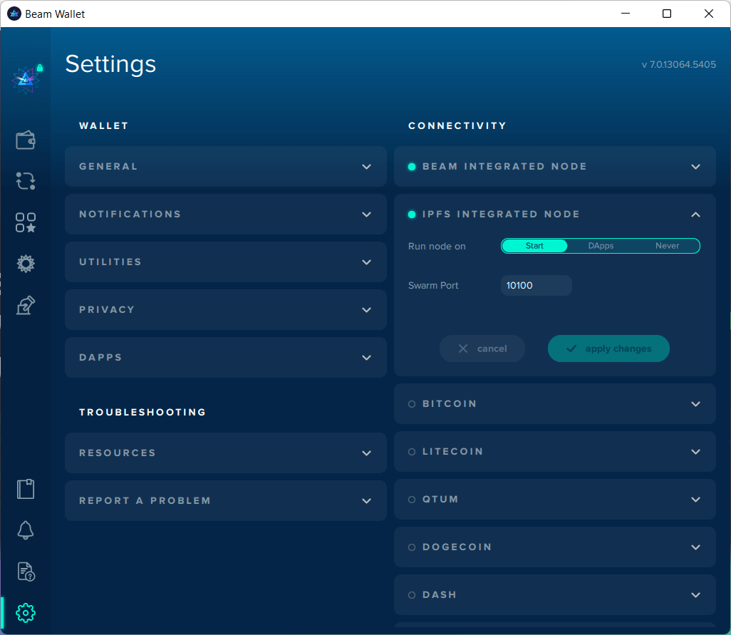 Toggle between your preferred Beam integrated node (integrated node or remote node) or connect your wallet to multiple cryptocurrencies for Atomic Swaps (not available on Beam mobile app).