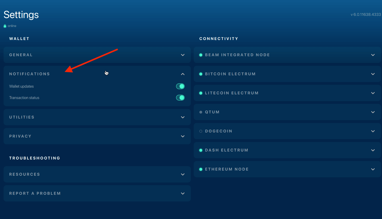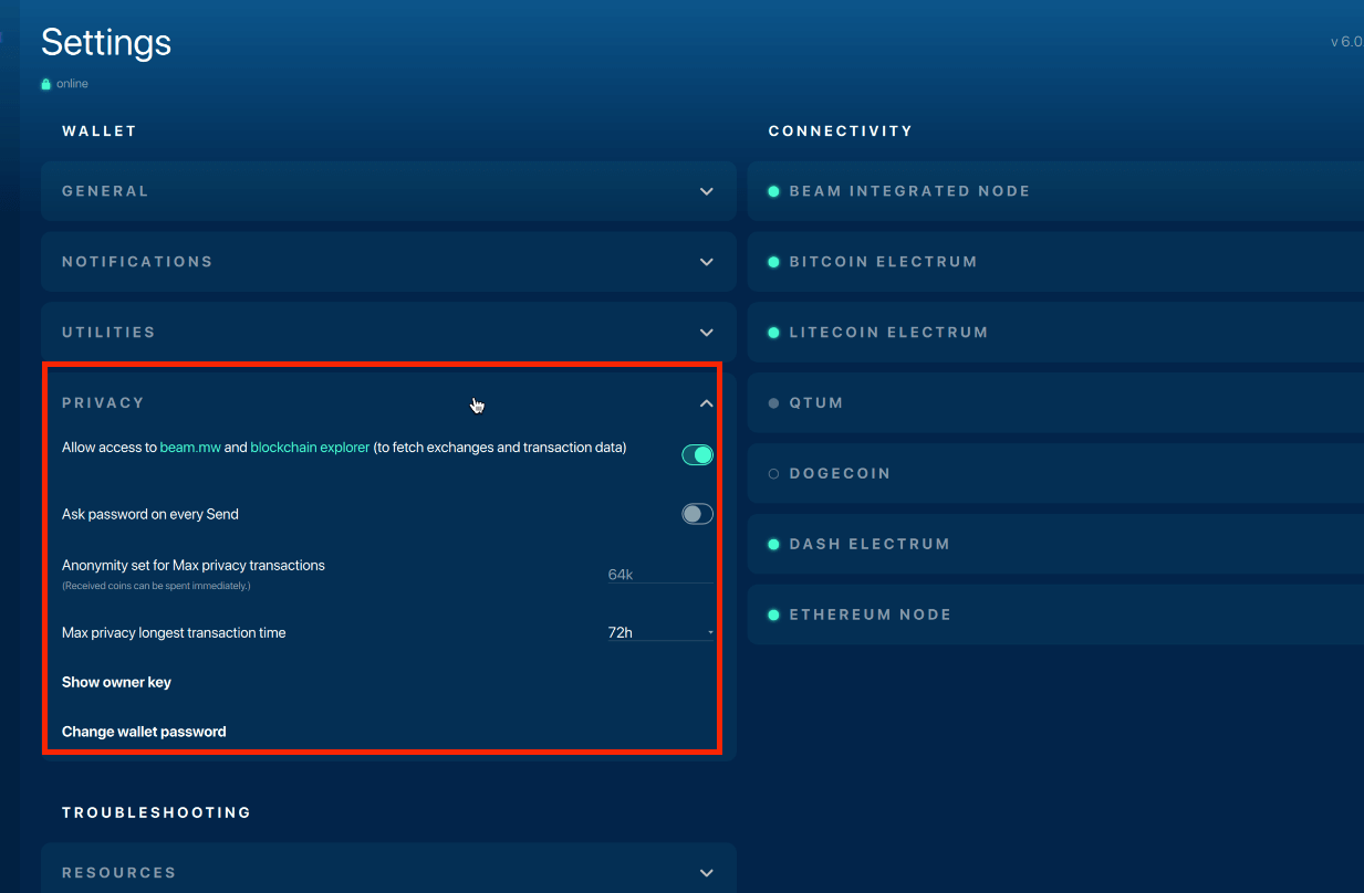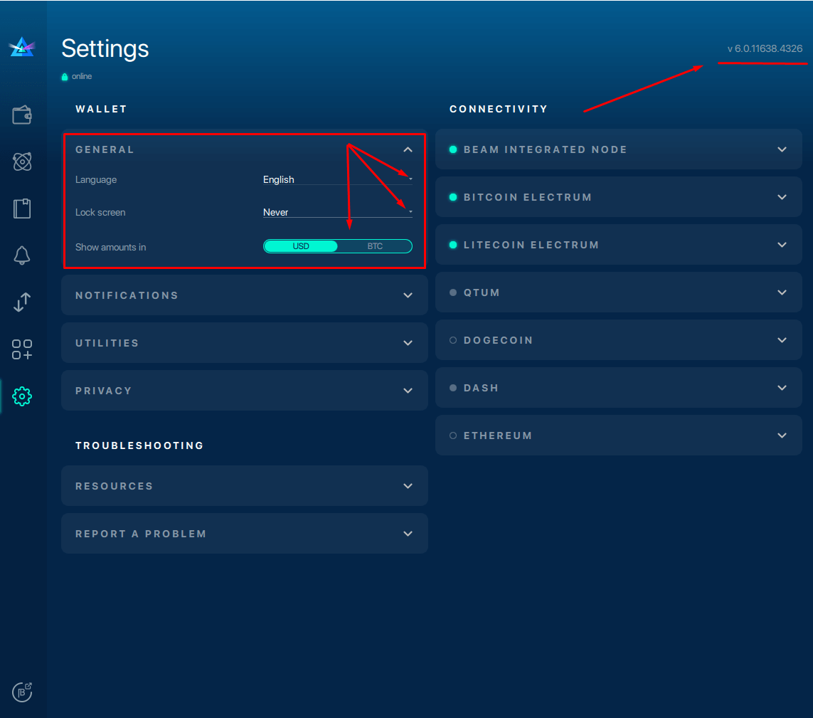 Your Beam desktop wallet offers users various preferences and advanced features that you can access from the Settings