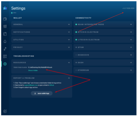 Locate your current Beam wallet version in the upper right corner of your wallet. Your Beam wallet version is a crucial detail to remember when seeking technical support.