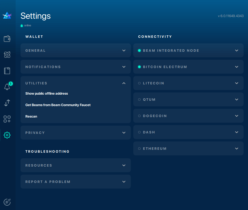 - Utilities: find your public offline address (show public offline address), acquire small amounts of Beams for testing purposes (Beam Community Faucet), or rescan the blockchain if you think your wallet balance is not up to date.
