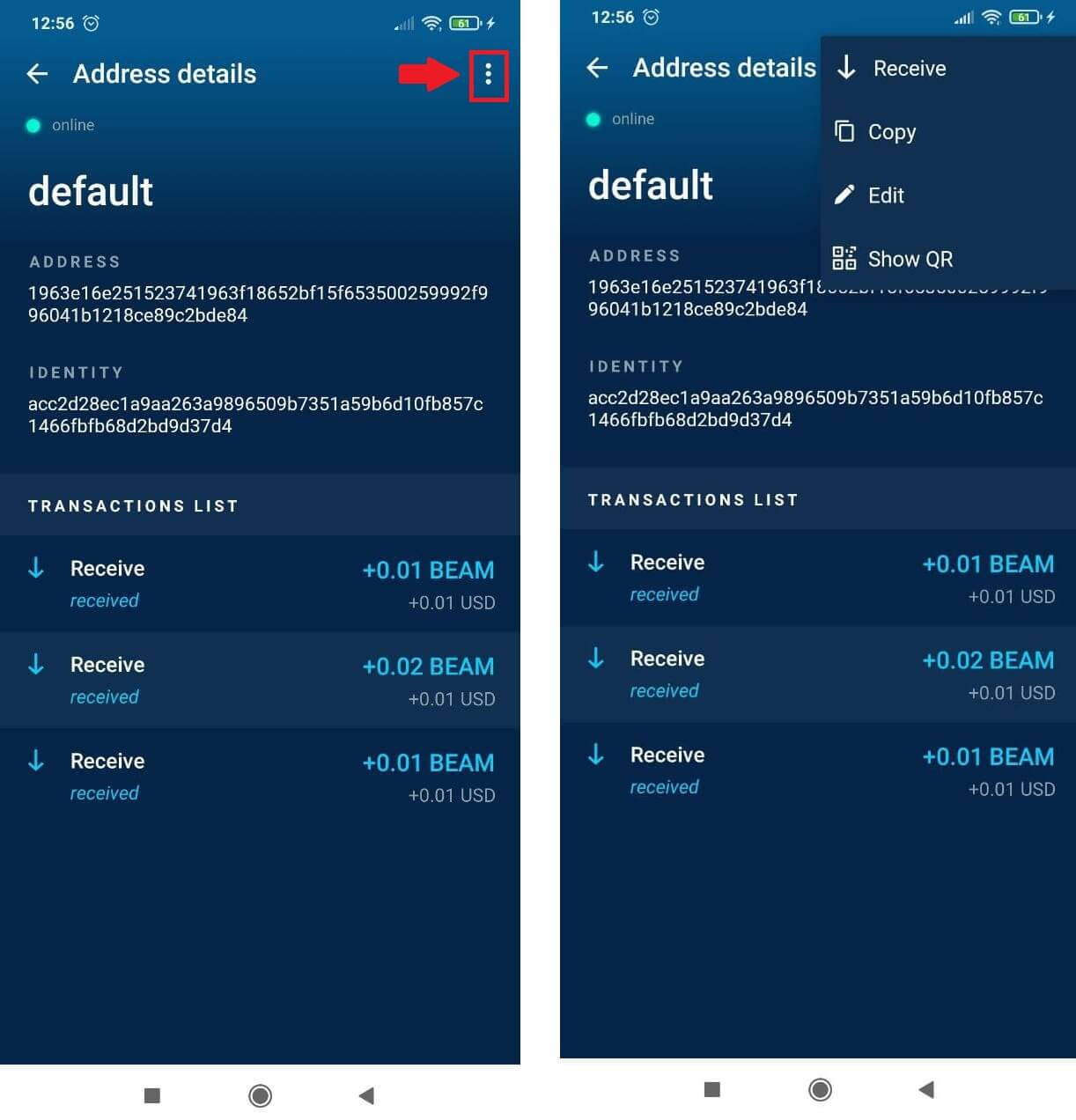 to reveal your address QR code. - Select edit