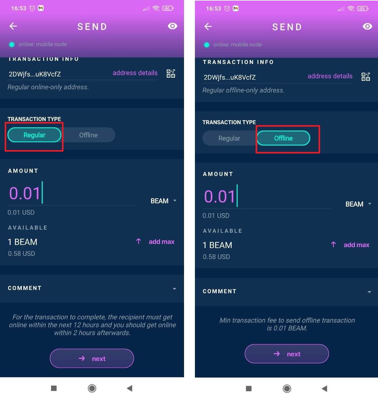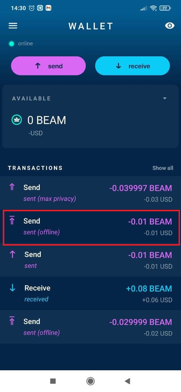 - Offline transaction: Fee = 0.011 BEAM (0.01-for shielded coin + 0.001-fee transaction).