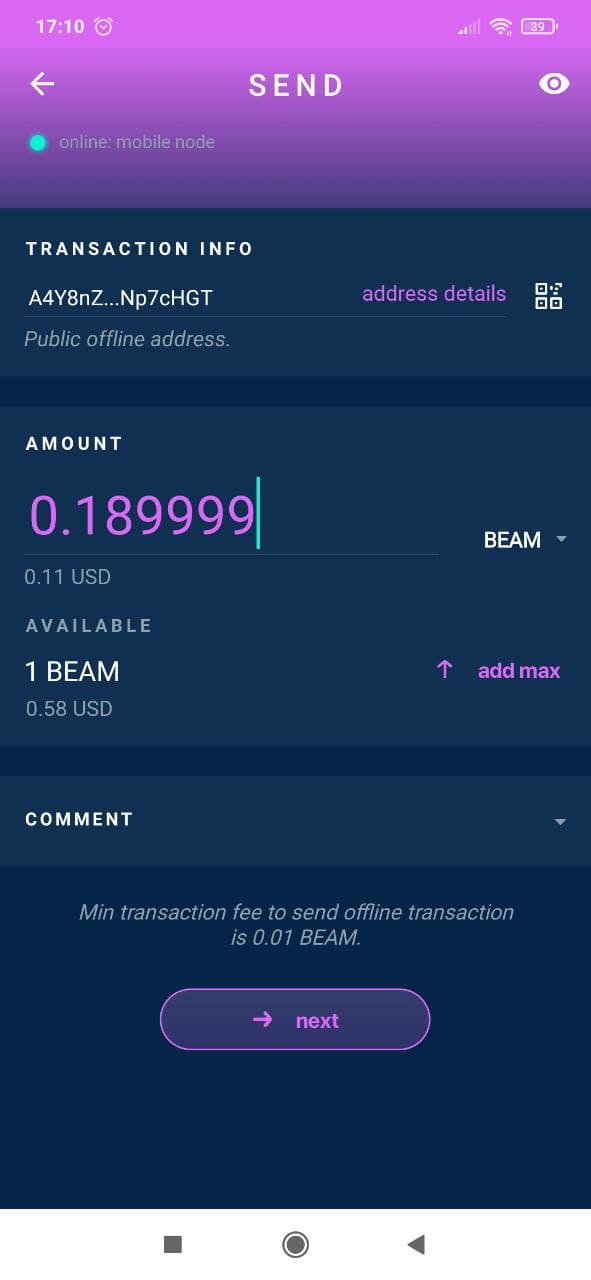 - Tap send to send your Beam coins.