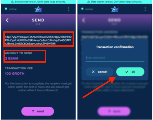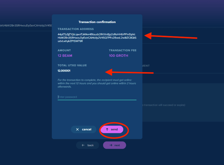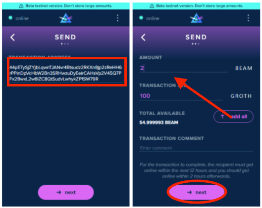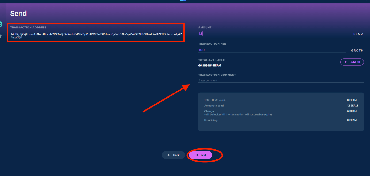 Copy and paste the wallet address in the "transaction address" field. You can add a comment in "transaction comments" (the comment will only be visible to you) for easier bookkeeping. Confirm the amount of Beam coins you wish to send before clicking "next."